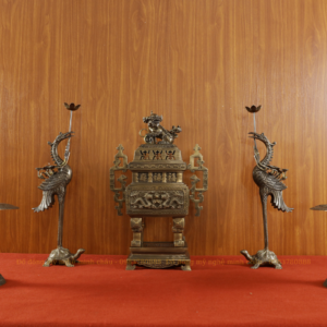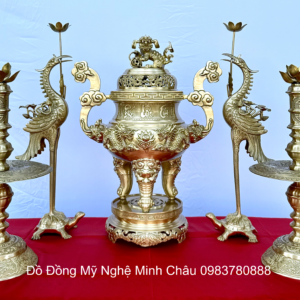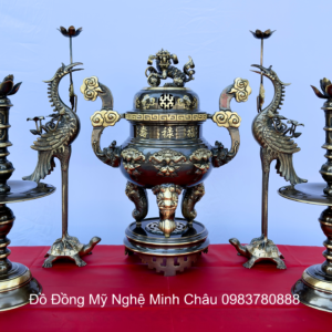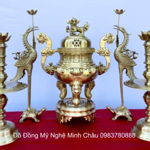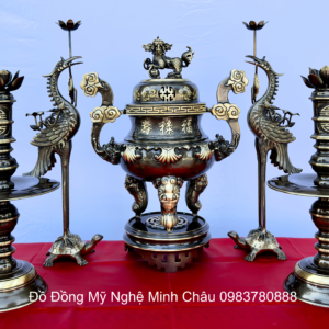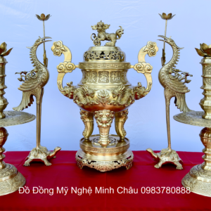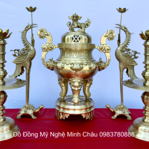 Bộ Ngũ Sự Đỉnh Vuông được chế tác từ đồng cao cấp, gồm đỉnh thờ vuông, đôi chân nến và đôi hạc. Đặc biệt, đỉnh thờ được thiết kế hình vuông độc đáo, tượng trưng cho sự vững chắc và cân bằng trong phong thủy. Bộ sản phẩm không chỉ mang giá trị thẩm mỹ cao mà còn là biểu tượng của sự hòa hợp, phúc lộc và bình an cho gia đình.