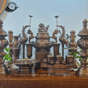 Bộ Thờ Đồng Đỏ Đầy Đủ là lựa chọn hoàn hảo cho không gian thờ cúng, bao gồm đầy đủ các món cần thiết như thân đỉnh, đôi chân nến, đôi hạc, đôi đèn, ống hương, lọ hoa, bộ đài, bát hương và mâm bồng, giúp tạo nên không gian linh thiêng, trang trọng và cân đối.