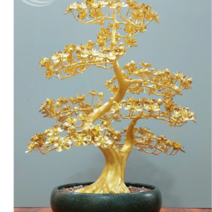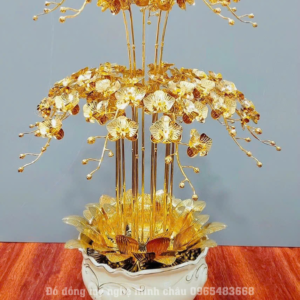 Cây hoa đào được chế tác với hình ảnh những cành đào uốn lượn mềm mại, kết hợp cùng các bông hoa vàng rực rỡ. Chân đế bằng gốm sứ cao cấp tạo sự vững chãi và tinh tế cho sản phẩm. Mỗi bông hoa đều được làm thủ công tỉ mỉ, tượng trưng cho vẻ đẹp hoàn mỹ và sự vĩnh cửu.