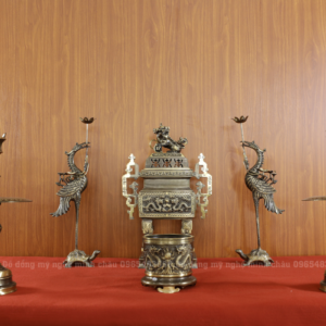 - Đôi Hạc Thờ Đứng Trên Lưng Rùa: Đôi hạc trong bộ Ngũ Sự Đỉnh Vuông được chế tác đứng trên lưng rùa, mang ý nghĩa sâu sắc trong phong thủy. Hạc là biểu tượng của sự trường tồn và cao quý, trong khi rùa tượng trưng cho sự bền bỉ và ổn định. Sự kết hợp giữa hạc và rùa là hình ảnh hài hòa giữa trời và đất, âm và dương, mang đến sự cân bằng, bình an và trường thọ cho gia đình.