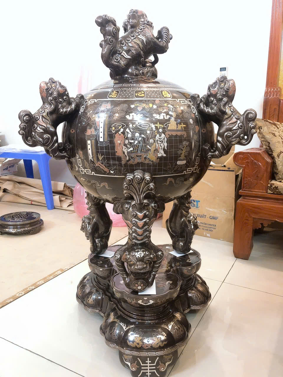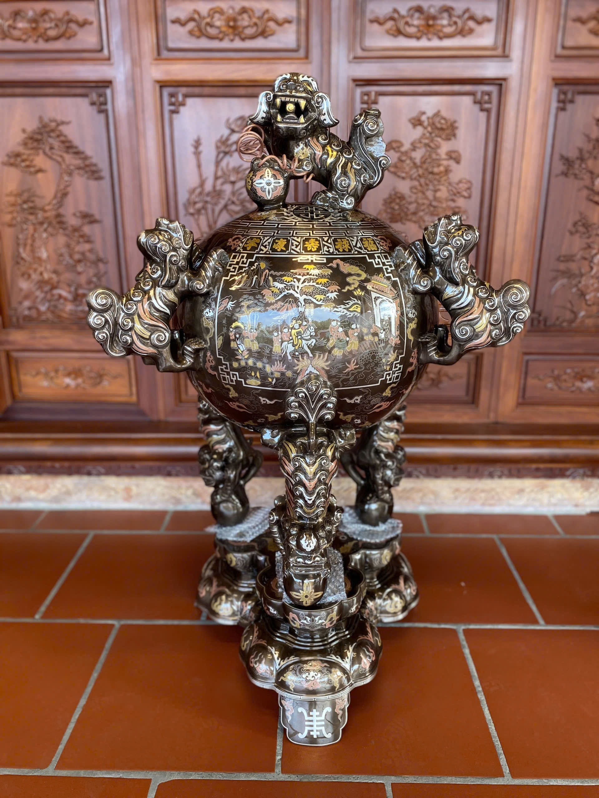 Đỉnh thất lân vờn cầu 1m08 được biết đến như một trong những vật phẩm vừa dùng để làm đồ thờ cúng, vừa có vai trò trấn an, cân bằng phong thủy cực tốt với hình ảnh 7 con nghê đang trong tư thế vờn ôm lấy quả cầu tròn. Vật phẩm không chỉ tăng giá trị thẩm mỹ cho không gian mà còn tạo thêm vẻ quyền thế, sang trọng, gia tăng vượng khí cho gia chủ, ngăn chặn những luồng khí xấu xâm nhập.