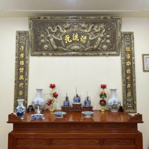 Hoành phi câu đối là bộ đôi vật phẩm không thể thiếu trong không gian thờ cúng. Hoành phi là tấm bảng ngang, thường khắc chữ Hán, chữ Nôm hoặc chữ Việt với ý nghĩa tốt đẹp, còn câu đối là hai tấm dọc treo hai bên. Khi được chế tác bằng đồng, chúng trở nên bền vững và sang trọng hơn, thể hiện sự trường tồn và lòng thành kính của gia chủ.