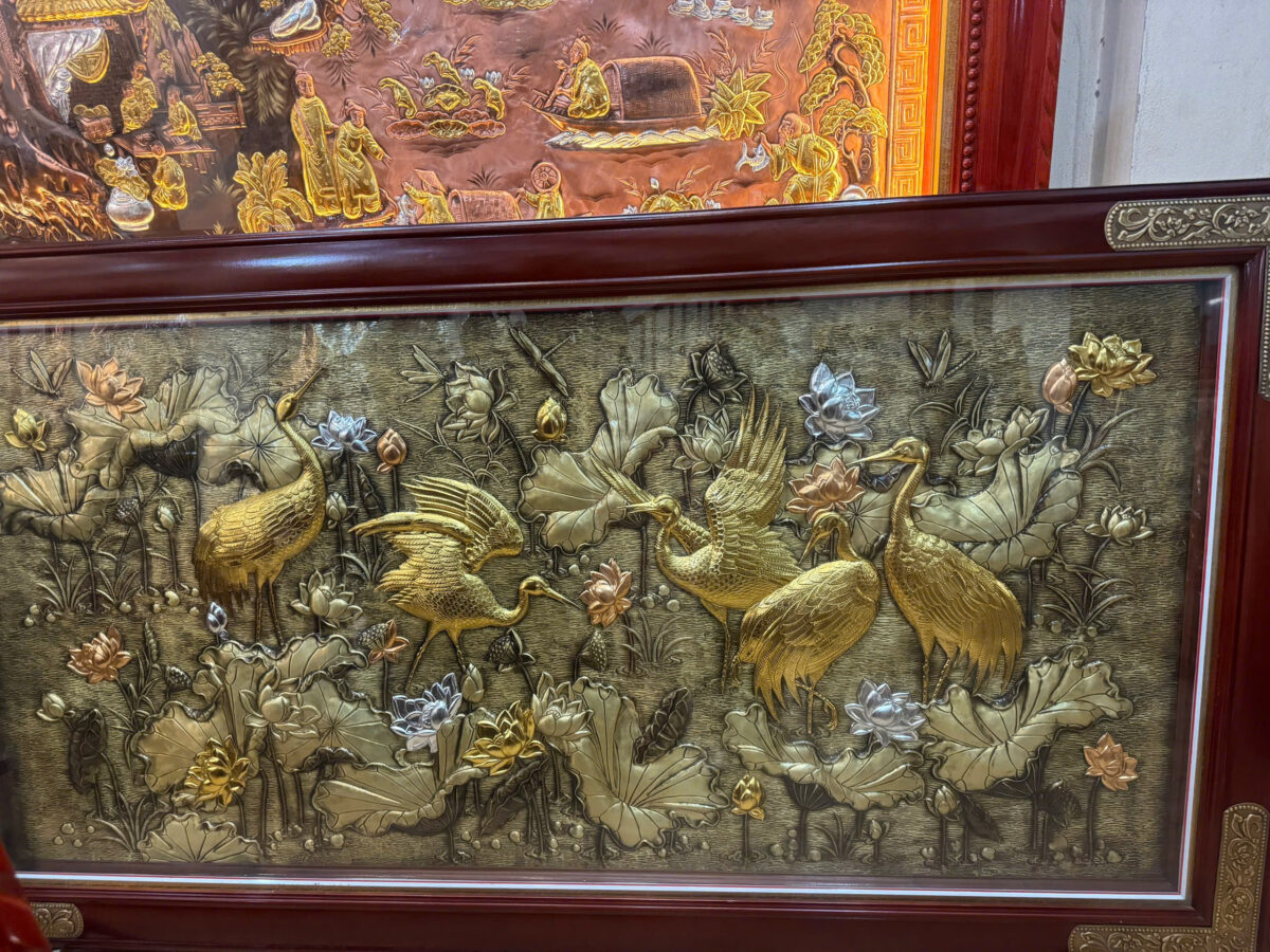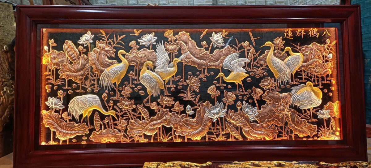 - Hình ảnh hoa sen và hạc trong bức tranh cũng tượng trưng cho sự sinh sôi, nảy nở và thịnh vượng. Điều này rất phù hợp với mong muốn phát triển tài lộc, sự nghiệp ổn định và thăng tiến. Đặc biệt, bức tranh được làm bằng đồng, một chất liệu có khả năng thu hút và duy trì năng lượng tốt, giúp kích hoạt tài lộc mạnh mẽ cho gia chủ.