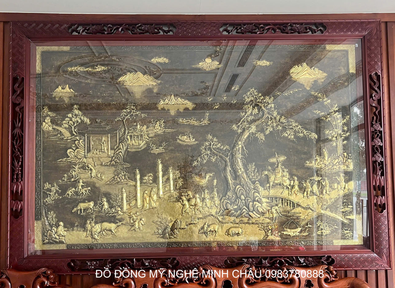- Màu sắc hài hòa: Sự kết hợp giữa màu vàng óng ánh của đồng và sự trang nhã của khung gỗ làm nổi bật tính thẩm mỹ của tranh.